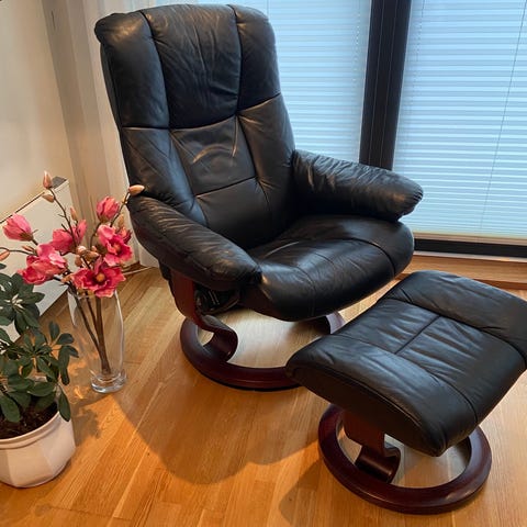 Synlig brukt gjennom generasjoner, men pent brukt. Ingen skader bortsett fra slitte armleer.