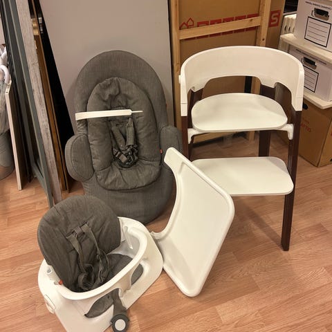 Selger en pent brukt Stokke Steps barnestol med tilbehør, se bilde. Vippestolen mangler nyfødtinnlegget. Følger også med sele til stolen. Stolen er stabil, moderne og svært praktisk, og kan brukes fra baby til større barn avhengig av tilbehør.