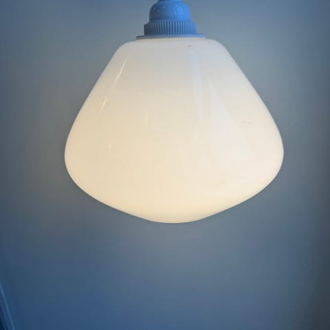 Lampa er 15 cm i diameter. Har en svak "spissing "mot slutten av kuppelen. Lengde fra tak og ned 21 cm. Pen i glasset. Porselen sokkel.