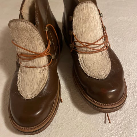 Dette er ikke de originale skallene men en sko med samme prinsipp. De har formen og reinskinn som går to veier i sålen for bedre grep på snøen.