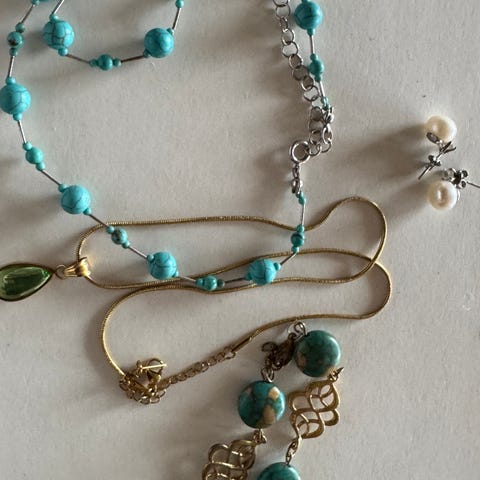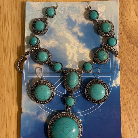 Som ny - Dette turkise smykkesettet inkluderer et halskjede med flere tråder, et armbånd og matchende øredobber.