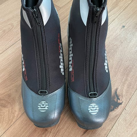 Alfa sko i svart og hvit farge. Skoene har snøring og er designet for bruk på ski. Materialet og størrelsen er ikke oppgitt.