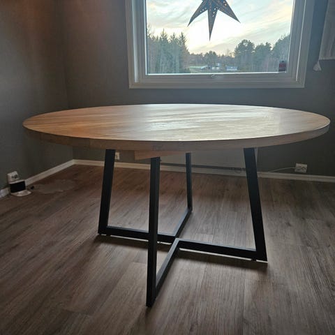 Rundt spisebord i svart eik med kryssbenkonstruksjon. Passer til spisestue eller kjøkkenområde, designet for å gi plass til flere personer rundt bordet. Det tilhører 2 illeggsplater på 50 cm per plate, så bordet kan bli ganske stort. Kjøpt hos interiørhuset alvøen. Olje følger med, bordet bør ha en ny runde med olje nå.