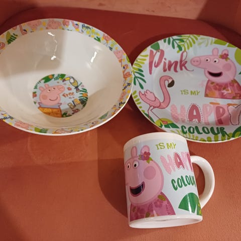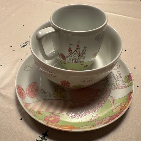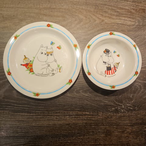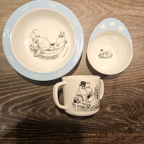 Tallerken, skål og skje med Mummi og Snusmumriken motiv på.