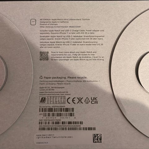 Jeg selger denne nydelige klokken fra Apple. Dette er en Apple Watch Ultra 3 i svart titan. Klokken er kun brukt noen få ganger og fremstår som veldig pen. Har brukt skjermbeskytter på klokken som enda er på.