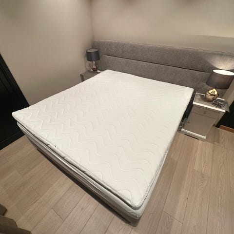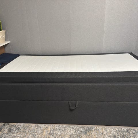 Beige Svane kontinentalseng str 180x200. Sengen har madrasser som du kan velge fast og myk side. Overmadrass har flekker, men kan byttes ut. Veldig god seng og ligge i.