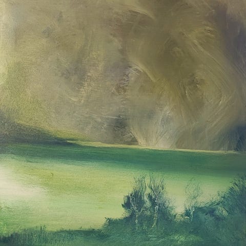Tapt i en drømmeverden .Maleri med abstrakt landskap i grønn og gul fargepalett. Passer til dekorasjon i hjem eller kontormiljø.