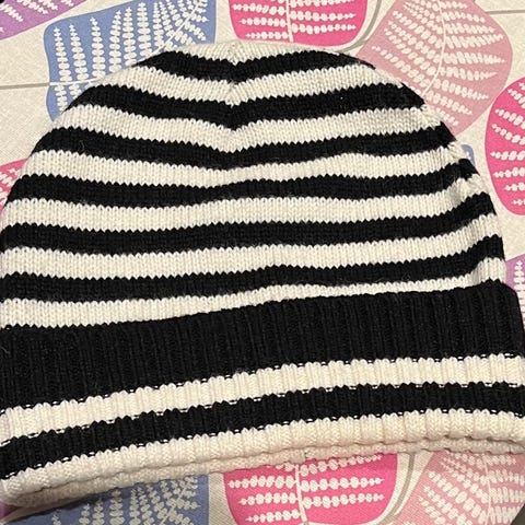 Veldig pent brukt Marimekko blå hatt i størrelse M. Hatten har et bredt brem og et mønster i blått, hvitt og svart. Passer til kvinner og menn.