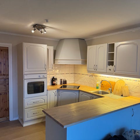 Selger komplett kjøkken grunnet oppussing. Flatene er fine med lite bruksmerker, kjøkkenet er trolig fra 2007 når leiligheten ble bygget. Alle hvitevarer selges også: kjøleskap, oppvaskmaskin, ventilator og komfyr. Skap har standard størrelse på 60x70 og 35 ut fra veggenpå vegghengt skap og 60 ut på skap under benk. Øyen har også to 60x70x140 skap pluss 3 hyller med 31, 26 og 13 i høyde, 60 bredde. Har også høyskap på 40 og 60, 194 høyt. Alle lengder i cm. Ta kontakt for mer info, nytt kjøkken kommer ca 23 jan, så ønskes hentes før det.