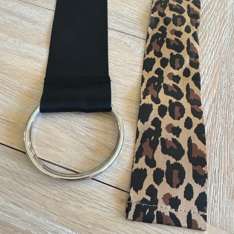 Dame belte med leopardmønster i blå og svart farge. Beltet har dekorative steiner langs hele lengden og en spenne med steindekorasjon. Designet for damebruk. Lege 120 cm