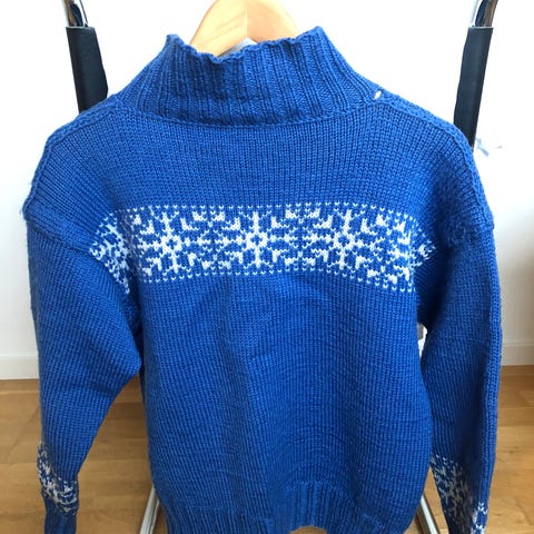 Hjemmestrikket ullgenser i mørkeblå med snøstjerne mønster