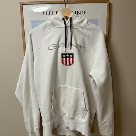 GANT Hoodie i størrelse XS for herre/unisex. Laget av bomull og polyester med grå farge. Genseren har hette og frontlomme, og viser GANT-logo med skjold på brystet. Hentes i Skudeneshavn eller sendes med fiks ferdig.