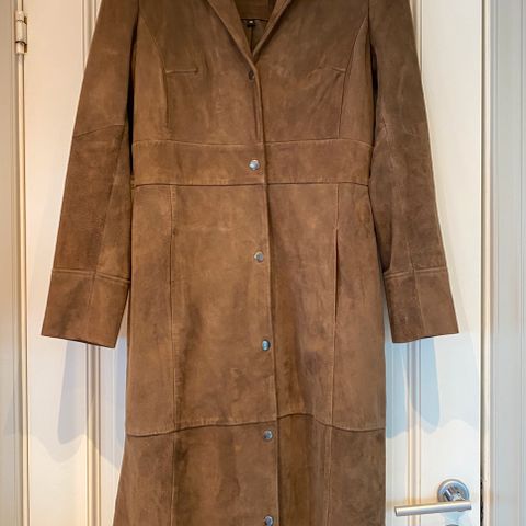 Skinnkåpen er svart og laget av skinnmateriale. Den har en lang modell med knappestenging og lommer. Innvendig foret med glidelåslomme og dekorative bånddetaljer.