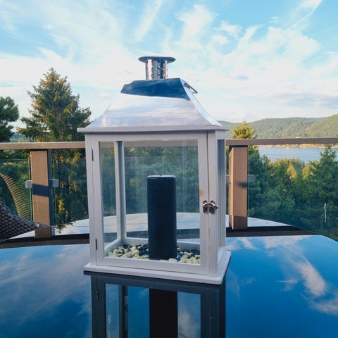 Dekorativ lykt i treverk med stoff/tekstilsider.