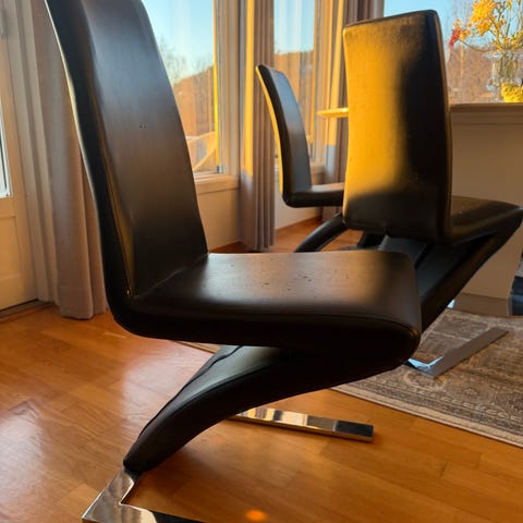 Seks stoler med moderne design selges samlet, kr 500, - pr stk. eller totalt kr 3.000. Stolene har sorte rørben.