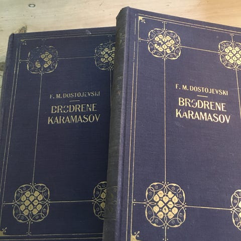 Dostojevskij: Brødrene Karamasov. Komplett i tre bind utgitt 1992. Bøkene er innbundet og har omslag, et ulest sett i pen stand. Lesesnorene ligger fortsatt på plass. Kan sende.