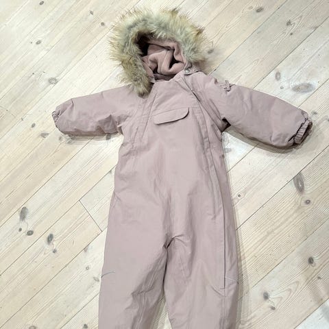 Wheat vinterdress størrelse 92 med flerfarget mønster. Kjøpt brukt av oss, med tanke om å sette på lapper på knærne- ble aldri gjort. Hull på begge knær som vist på bildene, ser ellers hel ut. Mangler fotstrikker. Kanskje noen andre vil reparere og bruke den?