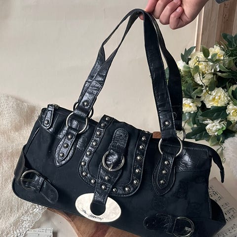 Svart skulderveske i skinn med tydelig Y2K-preg. Usikker på om det er ekte eller uekte skinn, men den er ganske fin, solid og myk i skinnet. Dekorative metallringer og nagler gir et litt edgy, retro uttrykk. Romslig og som passer fint til hverdagsbruk. Her har du rom til nesten alt! Noen få små hvite flekker helt nederst på innsiden, som verken er synlige eller påvirker utseendet. Se bilder for mål.
