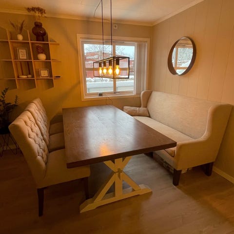 Selger et fint spisebord grunnet flytting. Noe bruksmerker, men fort gjort å lakke over!