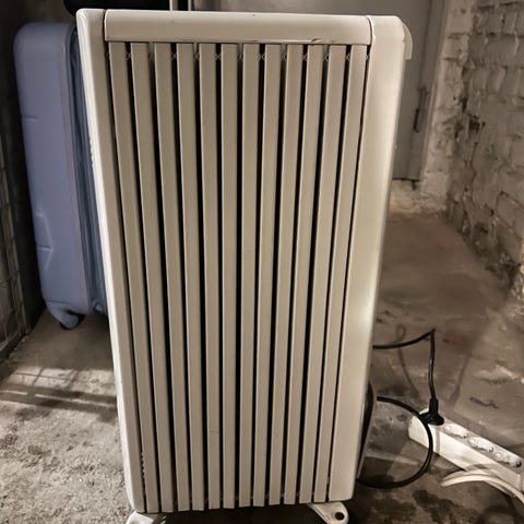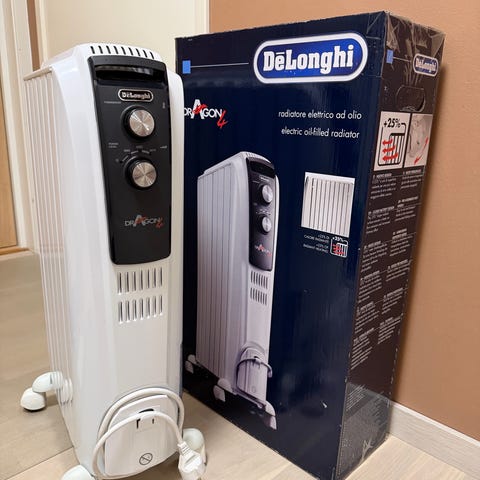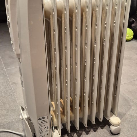 DeLonghi Dragon 4 oljeovn i hvit farge. Har flere varmeelementer og hjul for enkel flytting. Utstyrt med digitalt kontrollpanel for temperaturinnstilling og tidsur.