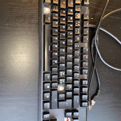 Selger tastatur i god stand og fullt fungerende. Tastaturet leveres med ekstra gjennomsiktige keycaps, i tillegg følger det med noen keycaps i japansk stil samt helt svarte keycaps for 60 %-delen av tastaturet. Selges på grunn av bytte til SteelSeries Apex Pro Mini Gen 3.