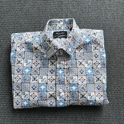 Sand: blomsterprint i str. 40 slim fit. Bomull