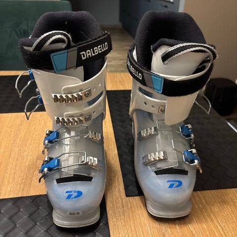 Dalbello Menace alpinstøvler med størrelse 22.5 Mondopoint. Tilsvarer str 36. Støvlene har fire spenner for presis justering. Sålelengde 269 mm.