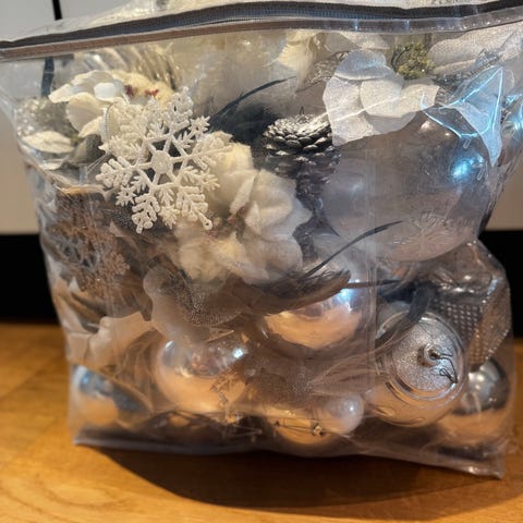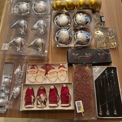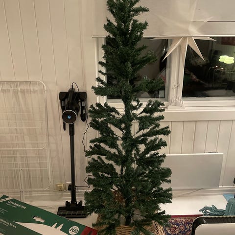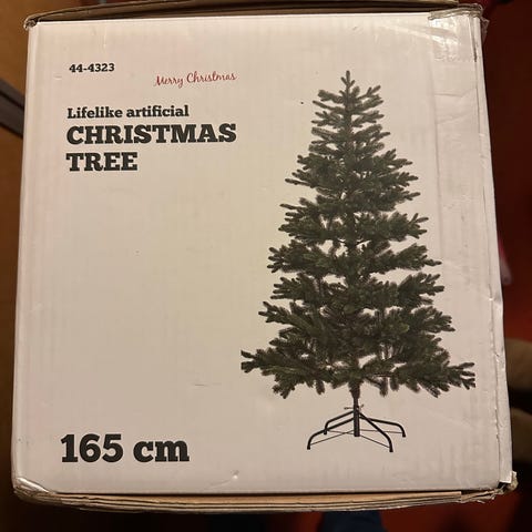 Kan taes fra hverandre i 3 deler. Tilhørende fot medfølger. Det er nå pakket ned i original oppbevaringseske og enkelt å hente og transportere. Klart for neste jul. Dette er raskt og enkelt å montere opp og ned og ser pent ut. Har målt bredden, se bilde for detaljer.