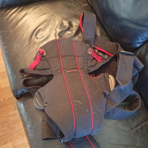 Den har blitt brukt av 2 babyer. Enkel å feste baby i og komfortabel å gå med.