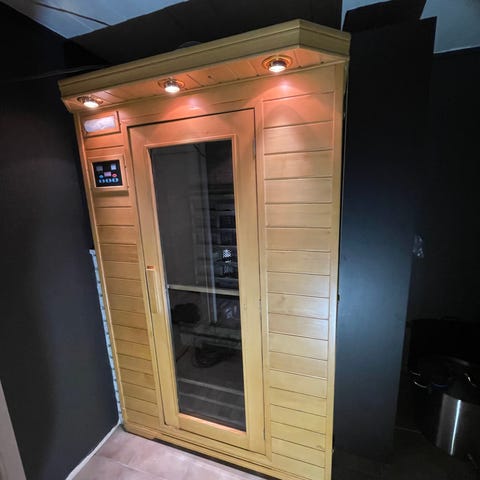 Badstue selges. Infrarød i vegger, til føtter, Lys innvendig og utvendig med panel på begge sider. Høytalere innvending med spiller (med radio, cd AUX på utsiden), Ion - Modul.