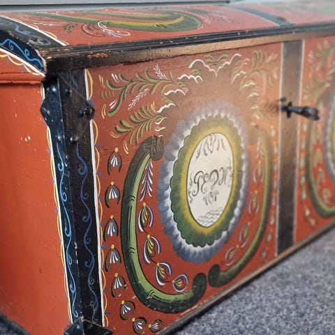 Antikk, håndmalt kiste – norsk folkekunst (1800-tallet)