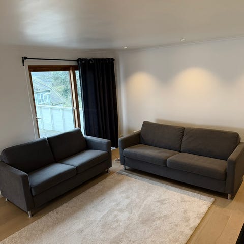Felton 3 seter og 2,5 seter fra Bohus i mørk grå stoff. Kommer fra hjem som har hatt hund og katt, men bærer lite/ingen preg av det. Tekkene er avtagbare og kan vaskes.