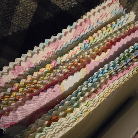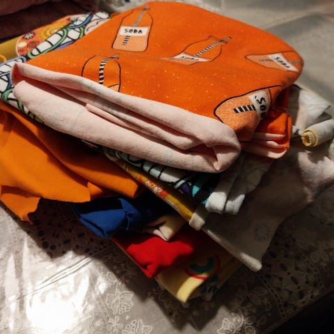 Jersey I ulike lengder, noe i hele meter, noe 0,5 meter og noen biter nok til pannebånd, luer / barneplagg. Noe fast bomull, ulike bånd. To bæreposer fulle.