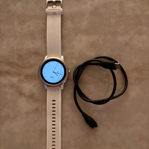 Garmin Vivoactive 3 smartklokke med GPS og innebygde sportsapper. Klokken har en hvit reim og rund urskive.