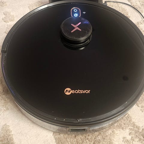 Robotstøvsuger i hvit farge. Enheten har roterende sidebørste og støvbeholder for effektiv rengjøring. Batteridrevet med automatisk lading. Den støvsuger og mopper. Kraftig støvsuge effekt