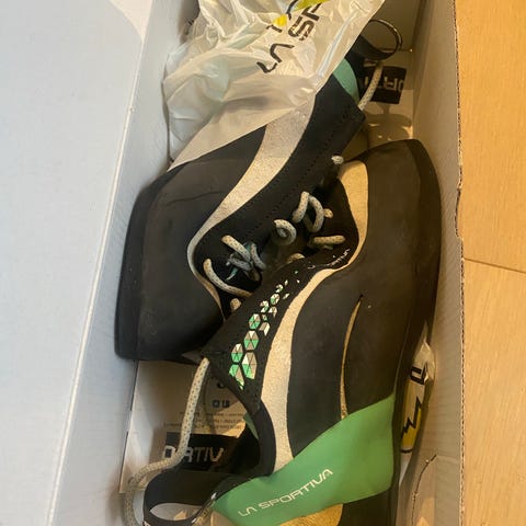 La Sportiva Futura klatresko for dame i størrelse 38. Skoene er grønne med svarte og beige detaljer. De har en spesialdesignet såle for klatring og er produsert i Italia. Modellen er laget for presisjonsklatring og har en tettsittende passform. (Ai generert)