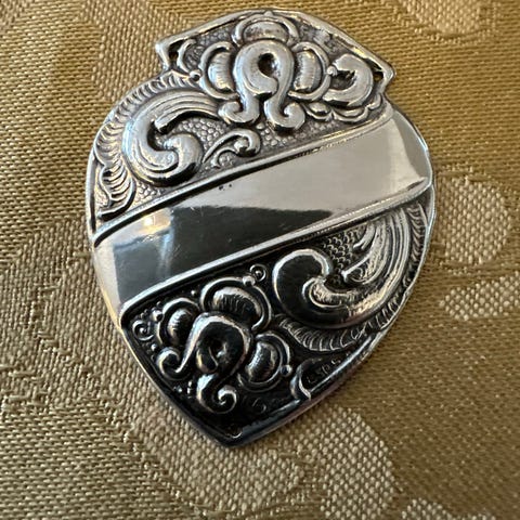 Frakkeskjold i 830 sølv. Fane, gamle og helt i orden. Uten skader eller graveringer.