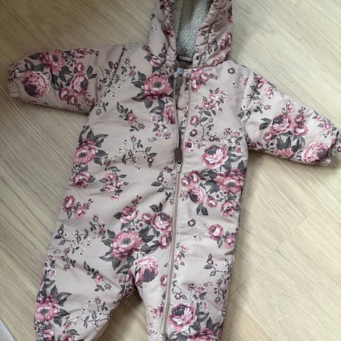 Kjempesøt vattert heldress fra Newbie i størrelse 68 (4-6 mnd). Dressen har et nydelig skogsmønster med rev og bjørn. Den har lunt teddyfôr i hetten og integrerte føtter som holder babyen varm. Glidelåsen går langt ned på benet, noe som gjør den enkel å ta av og på. Lite og pent brukt, fremstår som ny.