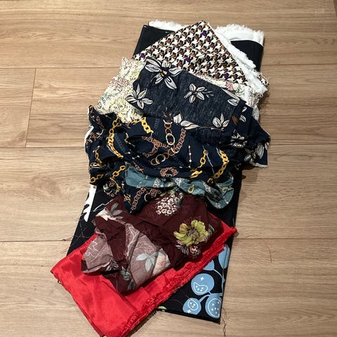 Leopard stoff er et fast stoff har ikke målt, men ca 1m, mønstret jersey er en rest, og det svarte er ca 0,5 m