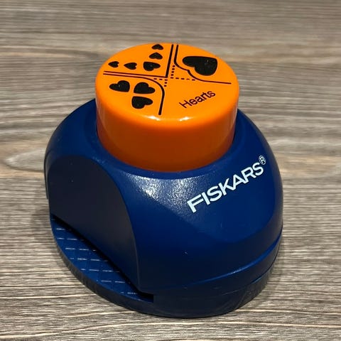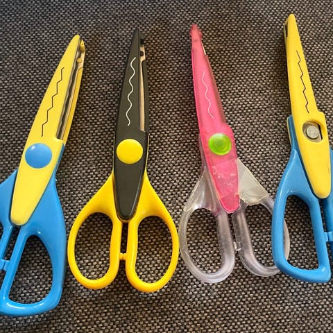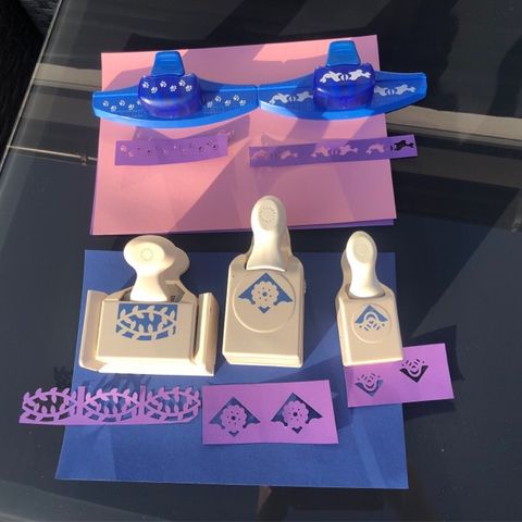 Sett med ulike papirhåndverksverktøy inkludert stanseverktøy i forskjellige størrelser og former, saks i flere størrelser og en linjal. Verktøyene kan brukes til papirklipping, stansing og dekorering i hobby- og håndverksprosjekter.