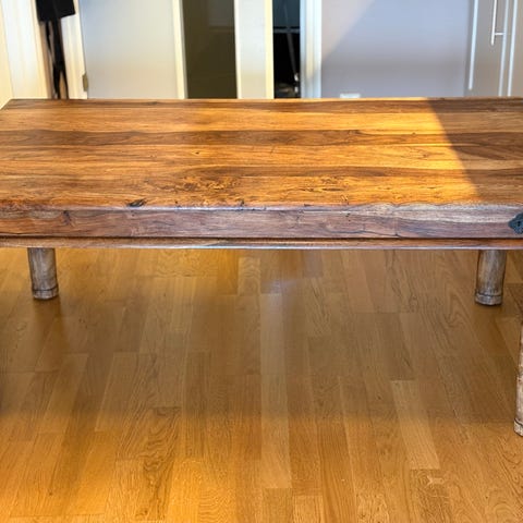 Pent brukt sofabord i rustikk stil med to store skuffer. Bordet er 180x80 cm