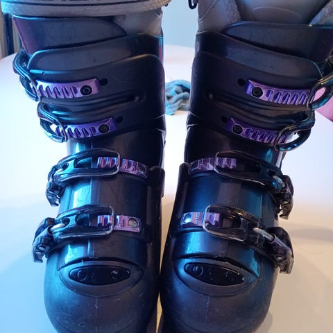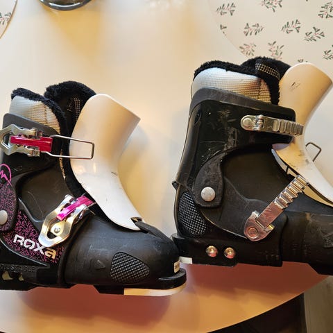 Roxa alpinstøvler med justerbar størrelse fra 180 til 215 mm. Støvlene har to spenner for god tilpasning og komfort. Fargen er svart med hvite og rosa detaljer.