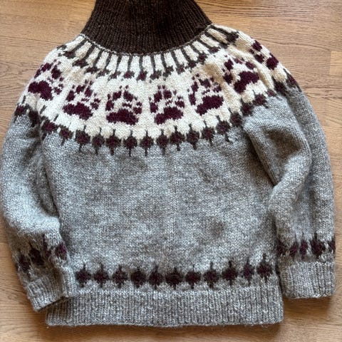 Strikket i islandske Alafosslopi. Veldig god og varm. Lite brukt.