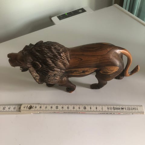 Håndskåret løve i massivt edeltre, trolig teak. Arvet, kjøpt i Asia (Kina/Japan) ca. 1960–70-tallet.