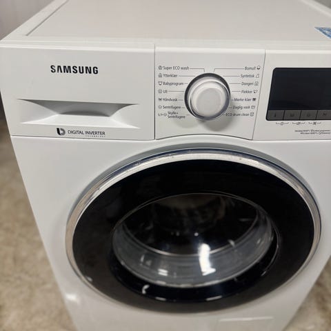 Denne Samsung vaskemaskinen er en frontmatet vaskemaskin med vask/tørk funksjon. Modellen har en kapasitet på 7 kg og er hvit med svarte detaljer. Vaskemaskinen har flere programmer og et digitalt display for enkel betjening.