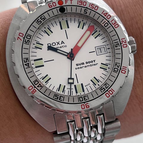 Selger en Doxa Sub 300T Professional (klassisk orange skive), kjøpt ny hos norsk forhandler i desember 2024. Klokken er pent brukt og fungerer helt som den skal.