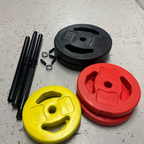 Vektstangen veier rundt 1,5kg hvor det da følger med 2 x 1,25kg, 2 x 2,5 kg og 2 x 5 kg.