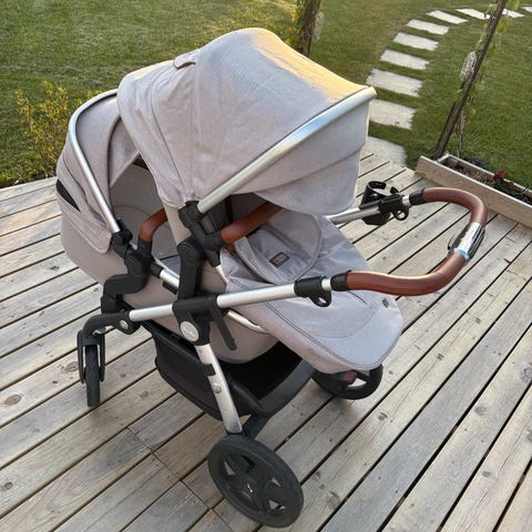 Veldig god vogn som er lett å trille på de fleste underlag, lett å feste og løsne barnet, og lett å legge sammen. Sittedelen er montert nå da det er den som ble brukt sist, men delene til liggedelen følger med og det er veldig enkelt å bytte. Bruksanvisning finnes på nett. Kalesjen trenger en vask og kan vaskes i vaskemaskinen etter demontering.
