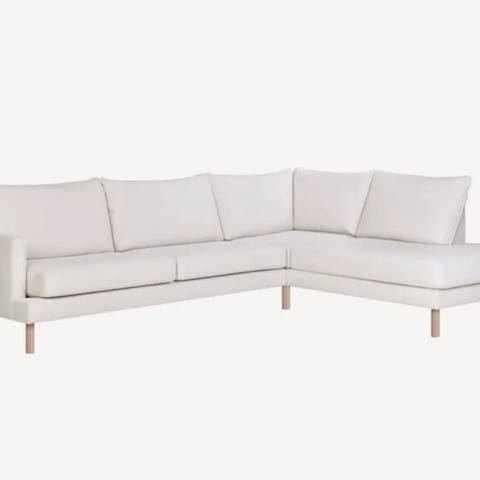 Sofa i mørk grått stoffmateriale. L-formet design med flere puter. Passer for stue eller oppholdsrom. Ryggputene kan reguleres