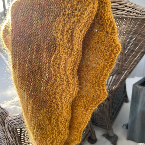 Stort sjal strikket i forgarn fra Hillesvåg. Veldig lett og varmt sjal i en fin brun/beige farge. Leveres med nål. Flere bruksmåter.